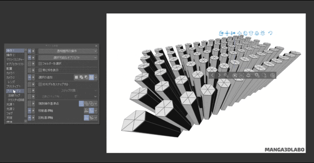 俯瞰でもあおりでも縦パースを直線にするにはサブツール詳細ウィンドウ↓レンズ↓垂直に補正カメラを極端に移動したり、向きを変えたい場合には補正をリセットすることまた、垂直水平にずらしたい場合にはレンズシフトのXYを使う。